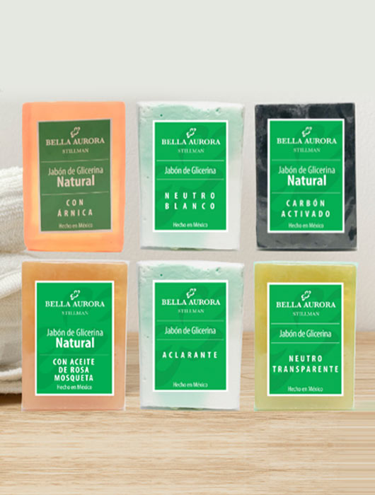 Es un jabón cuya base está constituida de glicerina. Es suave ideal para la piel normal o seca. Jabones especiales bases transparente y opacas sin color y sin perfume. Jabón aclarante y jabón con carbón activado.